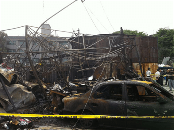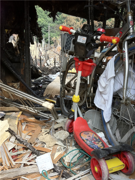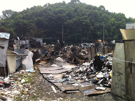 포이동에 도착한 우리는 화재현장을 돌아보았고 마을 분들과 인사도 나눴다. 마을 주민들은 공동으로 밥을 해 먹고 함께 잠을 잘 수 있는 공간을 만들었고 외부인의 방문에 경계의 눈빛을 보이기도 했다. 웃으며 인사하기도 어색한 시간이 흘렀다. 위로의 인사도 힘들었다. 마을 주민들의 경계는 포이동의 과거를 들으면서 어느 정도 이해할 수 있었다. 평택 대추리 주민들이 국가정책으로 강제이주 당했듯, 포이동 주민들도 국가정책이 만든 이주대책의 피해자들이다. 결은 다르지만 국가정책이 낳은 피해자들임에 분명하다.