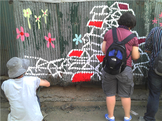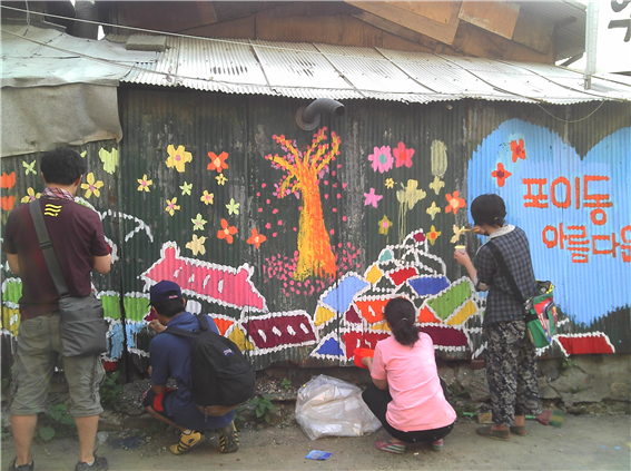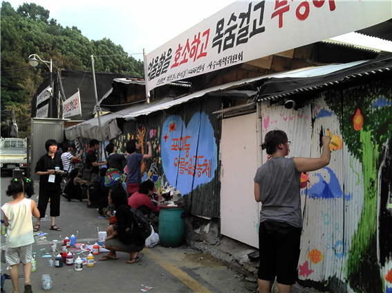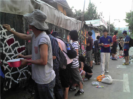 포이동 266번지에 연대한 사람들은 응원문화제를 준비했고 파견미술팀은 붓을 들었다. 응원문화제에 참석한 학생들과 마을입구 펜스에 이미지 작업을 하기로 하고는 잠시 이야기를 나누었다. 우리가 살고 싶은 공간, 마을 사람들이 원하는 공간을 이미지로 만들어 보자고. 빌딩과 고층건물이 서울을 뒤덮고 있는 상황에서 이 공간만은 소박한 집들이 옹기종기 만들어졌으면 좋겠다고 이야기하고 이윤엽 작가의 진행으로 이미지 작업에 들어갔다.