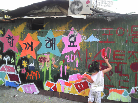 2011년에도 우린 바빴고, 돈도 없었고, 공간도 없었다. 붓 하나 들고 달려갔지만, 전국 여기저기가 투쟁의 현장이었고 삶이 치열하기만 한 시간들이었다. 용산 철거민들이 그러했듯 서울 포이동 판자촌 화재는 많은 사람의 기억에 남아있다. 6월 11일, 강남 한복판에서 살아보겠다는 사람들의 삶터가 한순간 무너져버린 날이다. 빈곤사회연대 활동가의 제안으로 파견미술팀은 이곳으로 달려갔다. 이즈음부터 파견미술팀 개개인도 생계 전선에 뛰어들어 시간을 맞춰 움직이기가 쉽지는 않았다. 그래서 두 명, 세 명이 움직일 수밖에 없었고 현장에서 함께 작업 할 수 있는 사람들을 모았다. 그러다 보니 제작보다는 그림 그리기 작업이 많았다.