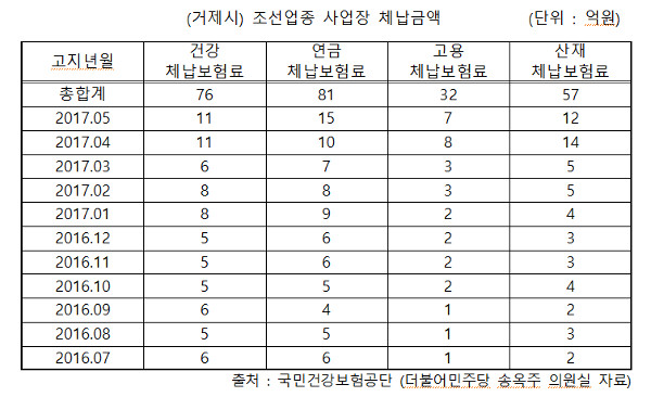 국민건강보험공단이 더불어민주당 송옥주의원실에 제출한 자료에 따르면, 조선업특별고용지원업종이 지정된 2016년 7월부터 2017년 5월까지 11개월 동안 거제시 조선업종 사업장의 국민연금 체납액이 81억 원에 달한다. 특히 체납액의 추이를 보면 상황의 심각성을 알 수 있는데 4~6억 원 정도이던 월 체납액이 시간이 갈수록 점점 커져서 2017년 4월에는 10억 원, 5월에는 15억 원이나 된다. 이 같은 추세라면 특별고용지원업종이 끝나는 2018년 6월까지는 국민연금 체납액만 약 200억 원이 넘을 것으로 추산된다.