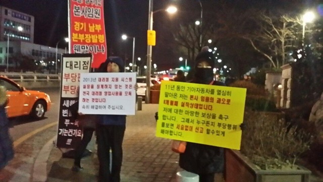 “한동안은 코트라 앞에다가 현수막 걸고 했어요. 하다 보니까 도대체 여기서 할 일이 아닌 거예요. 보이지도 않는데, 회사가 하나도 답답해할 게 없을 것 같더라고요. 그래서 서울경찰청 담당자한테 전화를 해서 사정 얘기를 하고 본사 앞에서 집회를 할 수 있게 해달라고 했어요. 그 사람이 서초경찰서에 전화를 해서 하나로마트 후문 앞(현대기아차 본사 우측)에 집회 장소를 허용해주라고 얘기를 해줬어요. 서초경찰서가 어쩔 수 없이 받아줬죠.”