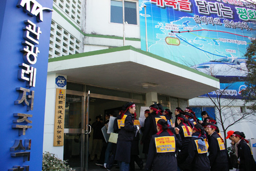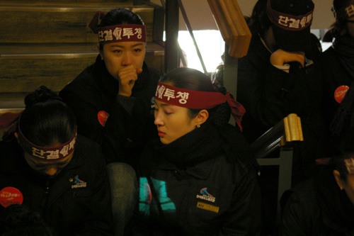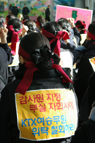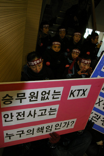 이에 27일, 서울KTX승무지부 조합원들은 KTX관광레저에 항의방문을 진행했다. 승무조합원들은 KTX관광레저 사장인 김웅 사장을 만나겠다고 했으나 이미 사장은 자리를 비우고 없는 상황이었다. 울분을 참지 못한 한 조합원은 “여승무원 400명의 목숨이 그렇게 하찮냐”라며 “젊은 여승무원이라고 맘대로 부려먹고 자르고 싶으면 마음대로 자르는 철도공사의 생각을 반드시 고쳐 놓자”고 목소리를 높이기도 했다. 이 소리에 자리를 함께 한 조합원들은 눈물을 흘렸다.