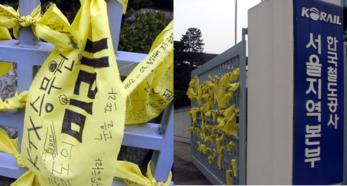 ▲ KTX지부가 농성중인 철도공사 서울지역본부 철문과 담장에는 조합원들이 매단 노란 천이 나부끼고 있다. |