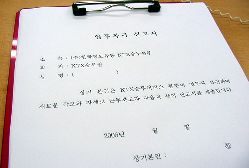 ▲ KTX승무본부 사무실에 비치되어 있는 '업무복귀신고서' |