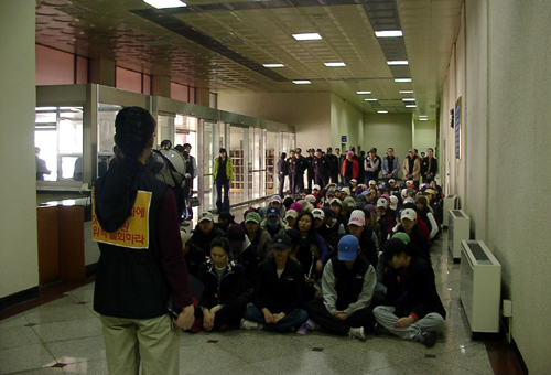 ▲ 이철 사장이 왔다는 소식을 들은 KTX지부 조합원들이 구 철도청사 로비에서 연좌하고 대화를 요구했다. |