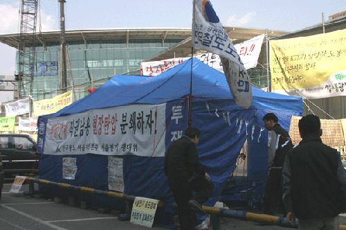 ▲ 철도노조 서울전기지부는 철도공사 서울지역사무소장이 "파업과 무관하게 지부임원과 평 조합원 2명을 징계하겠다"고 밝히자 지난 30일부터 서울지역사무소 앞에 천막을 치고 농성중이다. [출처: 철도노조] |