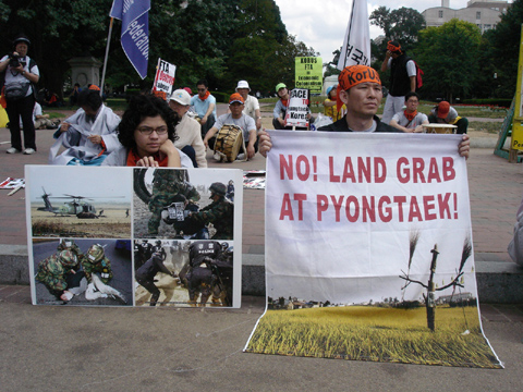 또한 오늘(6일) 일정에는 한미FTA 협상과 연관해 한국에서 전개되고 있는 평택관련 이슈가 첨가 됐다. 원정투쟁단과 참가자들은 라파엣 공원으로 이동해 평택 대추리에서 벌어진 사태와 미군 확장 이전 정책을 비판했다. 라파엣 공원의 북쪽으로는 바로 백악관이 이어진다.