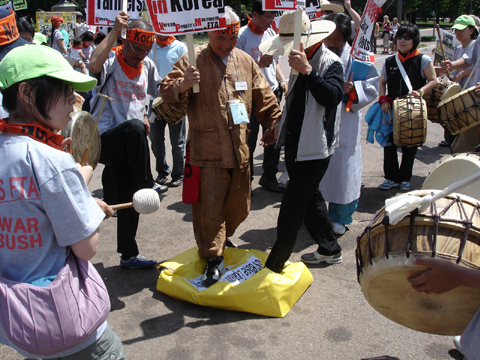 미국 원정투쟁을 전개하고 있는 한국 농민들과 노동자들은 '미국의 신자유주의 패권 경제, 정치 정책들로 인해 한국 민중들의 삶이 파멸에 직면했다'고 주장하며 다양한 노래와 구호를 외쳤다. 심지어 보안의 임무를 지고 있는 경찰들은 이들의 생기넘치는 풍물 공연에 발 박자를 맞추며 즐기는 모습이 종종 목격되기도 했다.