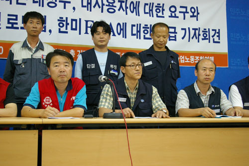 ▲ 기자회견에 참석한 박유기 현차노조 위원장, 전재환 금속연맹 위원장, 김창한 금속노조 위원장.(앞줄 왼쪽부터) |