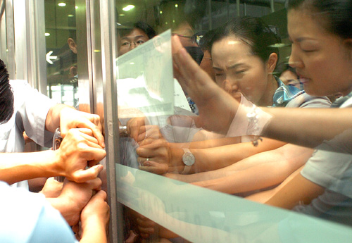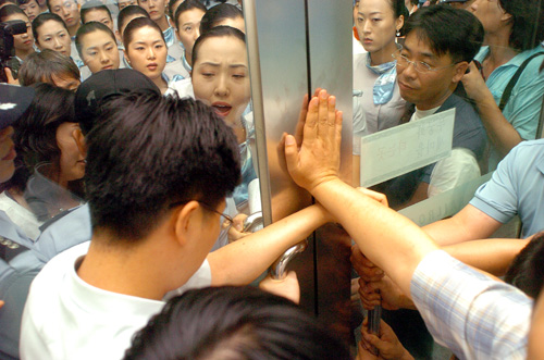 선전전을 마치고 KTX승강장으로 내려가려는 조합원들과 이를 가로막는 철도공안과 직원들이 문을 사이에 두고 실랑이를 벌이고 있다.