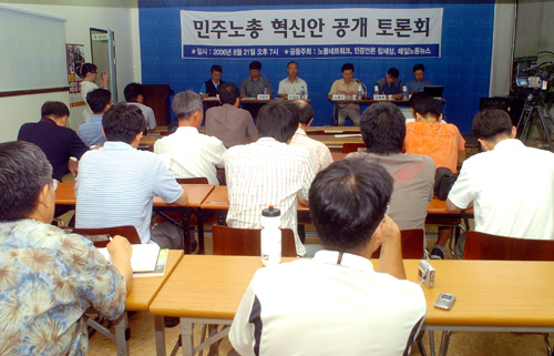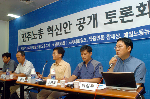 민주노총이 25일 임시대의원대회에서 다룰 예정인 '조직혁신안'과 관련해 공개토론회가 열렸다. 21일 오후 7시 민주노총 1층에서 개최된 이 토론회는 <노동네트워크>와 <매일노동뉴스>, <민중언론 참세상>이 공동 주최했으며, 노중기 한신대 교수가 사회를 맡고 김명호 민주노총 조직실장, 이성우 공공연맹 사무처장, 고영주 과기노조 위원장, 이경수 전 충남본부장, 박유호 금속연맹 조직실장 등이 토론자로 나왔다.