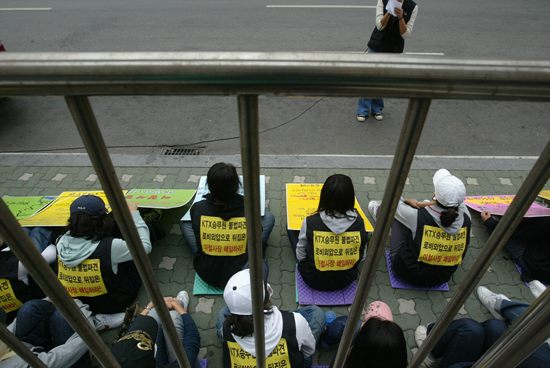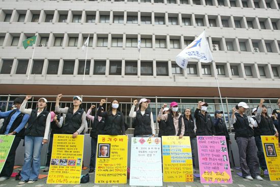 노동부 국정감사를 통해 불법파견 재조사 판정의 타당성 여부를 다시한번 주목받게 된 KTX승무원들이 17일 오전 9시 30분 서울 삼성동 코엑스 전시장 앞에서 기자회견을 열어 철도공사를 규탄하고 나섰다. 철도공사는 10월 16일부터 코엑스 전시장에서 '아시아 철도경영자 회의' 및 철도차량 전시회 행사를 갖고 있다.