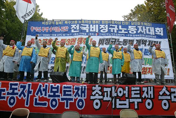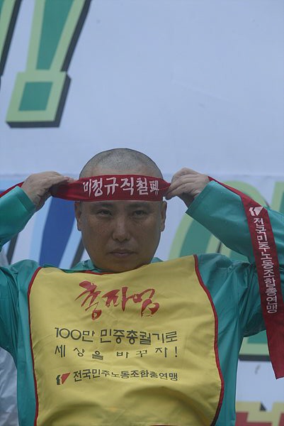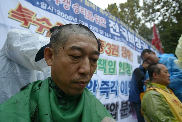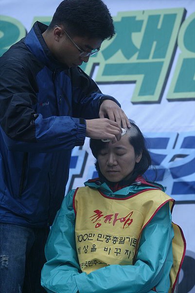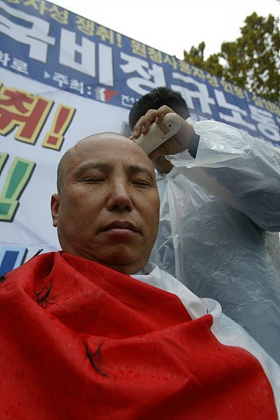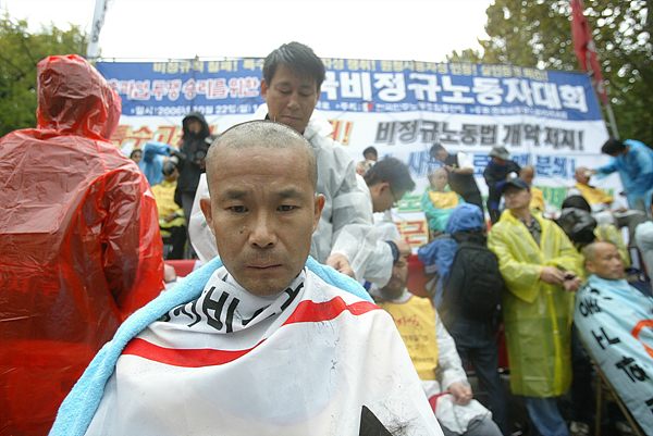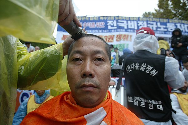 [포토뉴스]삭발, 총파업을 결의하며 김용욱 기자 2006.10.23 16:50 크게 작게 프린트 기사공유 | 차가운 가을비가 내리던 지난 22일 대학로, 전국비정규노동자대회를 진행하던 도중 20여명의 노동자가 집단으로 삭발을 했다. 수 많은 비정규 노동열사들의 영정앞에서 진행된 이날 삭발은 11월15일 민주노총 총파업 승리를 위한 결의의 의식이었다.