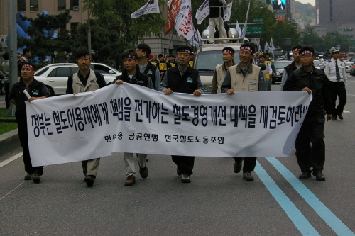 서울역에서 열린 철도노조 결의대회에서 김영훈 철도노조 위원장은 “철도공사가 우리가 1년에 두 번 파업을 할 수 없을 것이라는 오판으로 임금교섭을 무성의하게 하고 계속 합의안을 지키지 않는다면 철도노동자의 저력을 똑똑히 보게 될 것”이라고 경고했다. 현재 철도공사는 KTX승무지부에 관한 문제를 외면하고 있는 것은 물론 지난 3월 1일 철도노조의 파업으로 만든 합의도 지키지 않은 채 300여 명의 조합원이 중징계를 당하고 150여억 원을 가압류 하고 있는 상황이다.