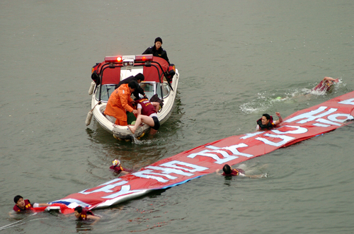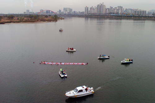 ▲ 삼성에스원 조합원들이 '부당해고철회하라'는 현수막을 물에 띄우고 구명조끼에 목숨을 의지한채 한강을 건너고 있다./이정원기자 |