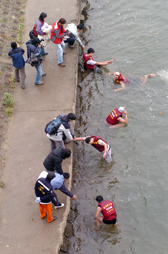 ▲ 마포대교 북단쪽 한강둔치에서 남단쪽 둔치까지 헤엄을 치며 선전전을 벌인 조합원들이 동료의 부축을 받으며 물속에서 나오고 있다./ 이정원기자 |