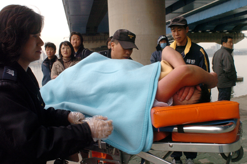 ▲ 한강을 헤엄쳐 건너온 한 조합원이 다리에 마비증세를 보여 응급차로 옮겨지고 있다./ 이정원기자 |