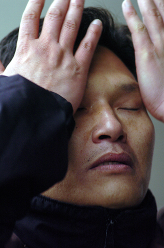 ▲ 김오근 삼성에스원노동자연대 위원장이 한강을 건너온 심정을 얘기하다가 터져나오는 울음을 참고있다./이정원기자 |