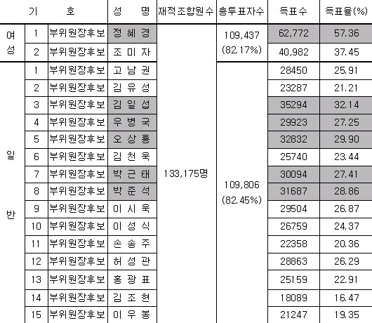 여성부위원장에는 10만9437명(82.17%)이 투표에 참가했으며 기호1번 정혜경 후보가 6만2772표(57.36%)를 득표해, 4만982표(37.45%)를 득표한 기호2번 조미자 후보를 누르고 당선을 확정지었다.