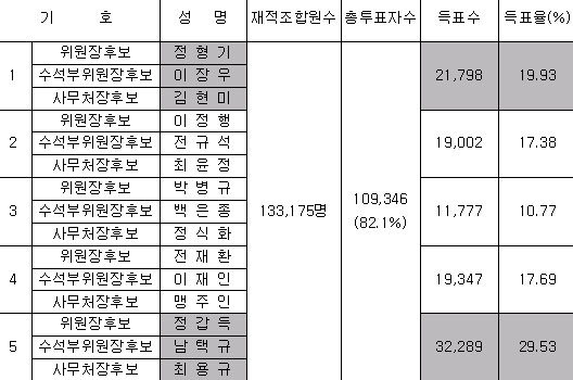 다음으로 기호4번 전재환-이재인-맹주인 후보조가 1만9347표(17.69%), 기호2번 이정행-전규석-최윤정 후보조가 1만9002표(17.38%), 기호3번 박병규-백은종-정식화 후보조가 1만1777표(10.77%)를 각각 득표했다.