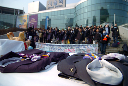 3월15일 KTX·새마을 승무원 조합원들이 서울역에 모여 전국을 순회하며 집중투쟁을 시작하는 기자회견을 열었다.