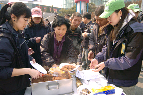 ▲ 승리 염원제가 끝나고 고사떡을 나누고 있다. |