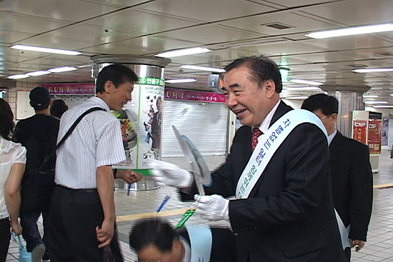 ▲ 비정규법 시행 첫 날, 이상수 노동부 장관은 비정규법을 홍보하는 부채를 시민들에게 나눠주었다. 같은 날 이랜드 비정규직 노동자들은 해고에 시달리다 홈에버 상암점에서 무기한 농성에 들어갔다./참세상 자료사진 |