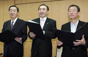 ▲ 이상수 노동부 장관과 이수영 경총 회장, 이용득 한국노총 위원장은 비정규법을 안착시키자며 '합의문'을 만들었다. 비정규법 때문에 해고된 이랜드 비정규직 노동자들이 점거농성 14일째를 맞는 날이었다. [출처: 노동부] |