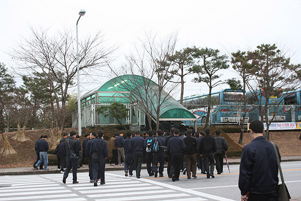 ▲ 날이 환한 저녁 5시 30분. 현대자동차 아산공장 주간 노동자들이 퇴근 버스를 타기 위해 계단을 오르고 있다. |