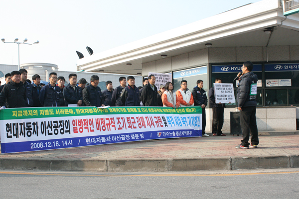 이어 작년 6월 서울중앙지법은 아산공장에 대하여 “불법파견이며, 2년 경과된 비정규직은 현대차(주) 직원”이라는 판결, 올해 11월 충남지방노동위원회는 ‘현대차(주) 아산공장의 사내하청으로 있는 비정규직 노동자가 정규직 노동자에 비하여 차별적 처우를 받고 있으며, 이를 시정하라’는 명령을 들며 “사내하청 비정규직 노동자가 차별을 받을 하등의 이유가 없다.” 고 강도 높게 현대자동차(주)를 비판했다.