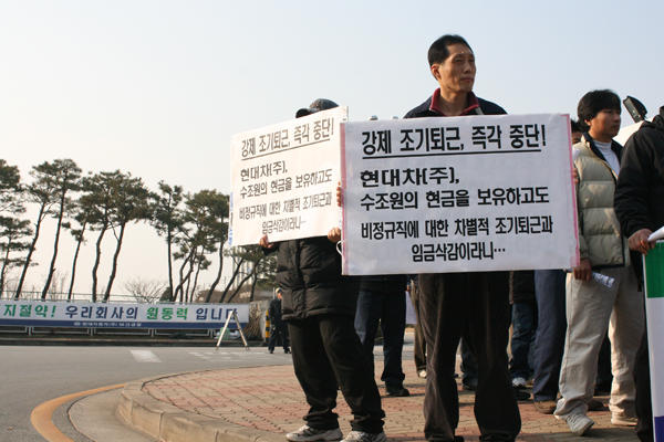 현대자동차 아산공장 사내하청지회에 따르면 지난 9일 현대자동차(주)는 10일부터 조업시간을 주/야 “각 5시간 생산 후 3시간 교육 등”으로 일방적으로 확정하여 발표했다고 전하며 “지금까지 정규직과 비정규직은 정규직 또는 비정규직만 일하여서는 라인이 가동될 수 없기 때문에 생산라인의 특성상 같은 시간에 일하고, 같은 시간에 쉬었다. 그럼에도 현대차(주)는 사내하청업체를 통하여 조기 퇴근을 지시했다.”며 분노했다.