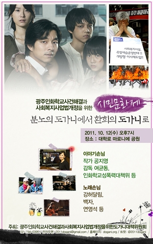 이어 도가니대책위는 이날 저녁 7시에 대학로 마로니에 공원에서 영화 ‘도가니’의 원작소설을 쓴 공지영 소설가, 여균동 영화감독, 인화학교 졸업생, 인화학교 졸업생, 인화학교성폭력대책위 관계자 등 이야기손님들과 강허달림, 백자, 연영석 등 가수들이 함께하는 ‘광주 인화학교 사건해결과 사회복지사업법 개정을 염원하는 시민문화제’를 개최한다.
