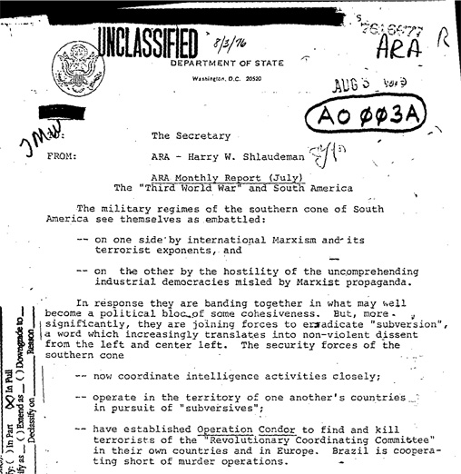 키신저의 남미 담당 수석대표인 윌리엄 로저스는 그에게 쿠데타 2일 후 “우리는 조만간 아르헨티나에서 억압에 필요한 많은 양의 피를 봐야 할”이라고 말했다(미국 국가 안보 기록 보관소, 2006년 3월 23일).