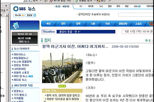 조수빈/ 먼저 민영방송인 SBS 부터 살펴보도록 하겠습니다. SBS는 평택 미군기지 예정지에 대한 강제철거와 철조망 설치를 강행하겠다는 윤광웅 국방부 장관의 지난 4일 담화문 발표를 시작으로 대추리, 도두리 일대에 진행된 행정대집행 상황을 헤드라인으로 보도했습니다. 이날 보도에서 <대추분교는 아수라장>, <평택 유혈충돌..시위대 60여 명 부상> 등 전쟁터를 방불케 한 당시 민과군의 물리적 충돌 상황을 보도하는 한편, 행정대집행의 정당성을 강조하는 국방부의 입장을 동시에 보도했습니다.