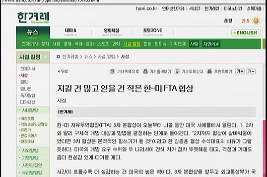 하주영/ 그런 점에서 본다면 한겨레의 한미FTA보도와 다소 어긋나는 것이 아닌가 싶은데요.
