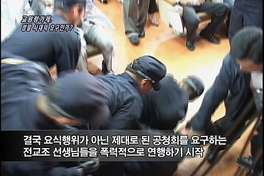 이현 / 네, 이날 현장에는 대규모의 병력들이 공청회 시작전에 배치되어서 행사 진행 방해와 상관없이 전교조 교사 25명 폭력연행하는 사건이 벌어졌습니다.