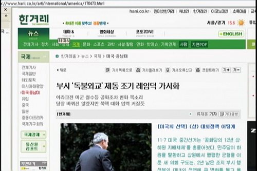 한겨레는 6일부터 8일까지 <부시 ‘독불외교’ 제동 조기 레임덕 가시화>, <미 의회 민주당 장악 ‘부시의 전쟁’졌다> 등 총 13개의 기사를 내보냈습니다.