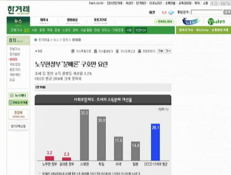 지난 1월 23일 박 현 기자는 ‘노무현 정부 분배론 구호만 요란’이라는 기사에서 노무현 정부의 분배정책에 대해 평가하고 있는데요. 기사는 “참여정부가 출범 직후부터 분배정책을 강조해 왔지만, 실제 소득분배 개선 정도는 매우 미미한 것으로 나타났다”라면서 “이는 외환위기 이후 양극화가 급격히 진행된 데 비해 사회보장제도와 조세의 소득 재분배 기능이 미흡했기 때문으로 분석된다”라고 보도했습니다.