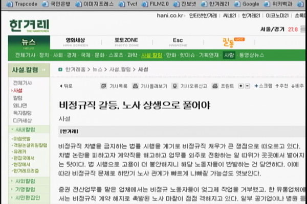하주영/ 워낙 노동이슈가 많았죠. 아무래도 최근이라 더 생각이 많이 나는데요. 비정규직법 시행에 맞춰 대량해고된 이랜드-뉴코아 사안에 대한 개혁언론의 보도도 다뤘지요.