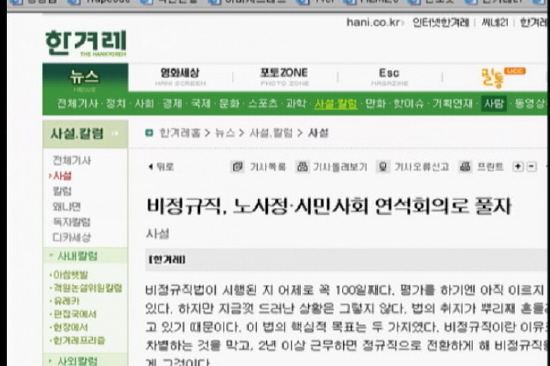 조수빈/ 한겨레신문은 노사정위와 같은 논의의 틀 구성이 해결의 출발점이 될 것이라고 주장하고 있습니다. 이미 지난 언론의 재구성에서도 지적했지만, 노사정위든 다른 형태든간에 비정규직 해결을 위한 틀거리를 구성하는 것이라면 노사정의 교섭이 없을 수 없고, 노사정 각 당사자의 처해진 조건이 불평등한 상황에서 결국 이는 비정규직노동자들의 일방적 희생을 강요할 수밖에 없는 구조가 될 것이라고 우려를 나타낸바 있습니다. 그러나 여전히 한겨레신문은 노사정위 등 논의틀 구성이 해결의 실마리인 것처럼 보도하고 있습니다.