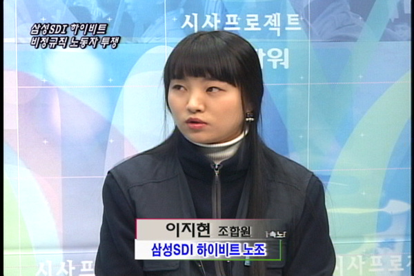 이지현/ 모든 업무지시나 물량체크를 삼성에서 관리를 했습니다. 그리고사장님과 회사이름(하이비트)가 있었지만 이름만있을 뿐이었어요.. 건물과 설비와 자재가 모두 삼성것이었고 삼성이 관리를 했었어요..그런데 어느날 갑자기 도급화가 되었다면서 사무실용 칸막이를 저희들과 정규직이 일하는 중간에 가져다 놓더라구요.. 한공정에서 같이 일하는데 칸막이만 있었어요. 불량이 나면 삼성간부들이 우리를 혼내곤 했어요.. 부당해고 신청을 했는데 중노위위원들도 그랬어요. 증거자료가 부족해서 기각되었다고. 우리가 회사에 있을때 알았다면 증거가 있겠죠. 하지만 또 다른이유는 삼성이라서 그런것 같아요.