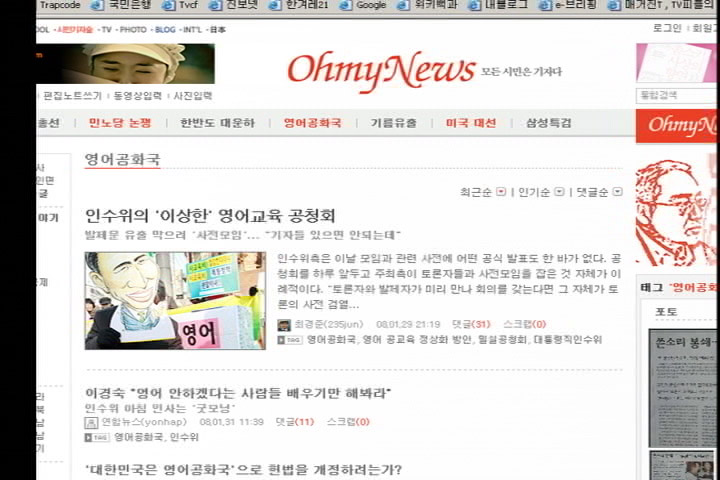 조수빈/ 또다른 개혁언론인 오마이뉴스도 마찬가지입니다. 오마이뉴스는 메뉴바 키워드 중 영어공교육을 클릭해서 들어가면 시민기자와 오마이뉴스 기자들이 쓴 기사들이 모두 검색됩니다.