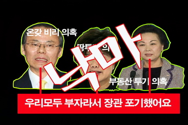 홍석만/ 제가 보기엔 재산형성이나 각종 의혹도 문제지만 이게 더 문제인 것 같습니다. 장관들의 가치관을 엿볼 수 있기 때문인데요, 변명이 한마디로 가관입니다. 자연의 일부인 땅을 사랑했을 뿐, 땅투기는 아니다라던가, 배용준보다는 적게 벌었다. 남편이 사줬다, 교수 25년 해봐라 그 정도 못 버냐는 등 해명아닌 해명을 해서 여론을 더 악화시키게 되었습니다. 결국 이춘호 여성부장관 내정자의 사퇴에 이어 박은경, 남주홍 내정자 등 줄줄이 사퇴하게 되었습니다.