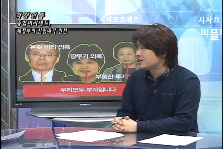 하주영/ 부자라서 문제가 되는 건 아니다. 이명박 내각 청문회를 앞두고 대통령이 한 말인데요. 부자라서 문제겠습니까. 어떻게 부자가 되었는가가 문제겠지요. 이명박 초대 내각의 후보자들은 부동산 투기, 땅투기, 탈세 등등 온갖 비리의 온상을 데려온 듯 합니다. 정말 그런 부정과 비리를 저지르지 않고도 부자가 될 수는 없는 걸까요. 시사프로젝트 피플파워 여기까지입니다. 끝까지 시청해 주셔서 고맙습니다.