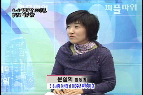 문설희/ 어느 순간부터인가 여성의 날은 ‘어머니의 날’과 ‘발렌타인데이’를 뒤섞은 형태로 변질되고 있습니다. “3월8일에는 여성들에게 꽃과 초콜렛을 선물하세요~”라는 선전문구가 여성의 날이 되면 등장하는 실정이니까요. 이러한 모습은 비단 광고에서 뿐만이 아닙니다. 작년 3월8일 서울지역에서 열린 99주년 여성노동자대회에서 민주노총의 한 여성간부는 “오늘 남성 동료가 꽃을 주던가요? 남편에게서 선물을 받으셨나요?”라고 확인을 하시더군요. 우리의 기억 속에 ‘여성의 날’은 여성들 애썼다며 선물을 받는 기념일 정도로 여겨지고 있다는 것을 반증하는 하나의 에피소드가 아닐까 싶습니다. 전 세계적으로도 여성의 날은 저명한 여성인사들을 모시고 한 말씀 듣거나, 유명 한 여성 연예인들의 공연을 즐기는 기념행사를 치루는 날로 변질되고 있는, 안타까운 현실입니다