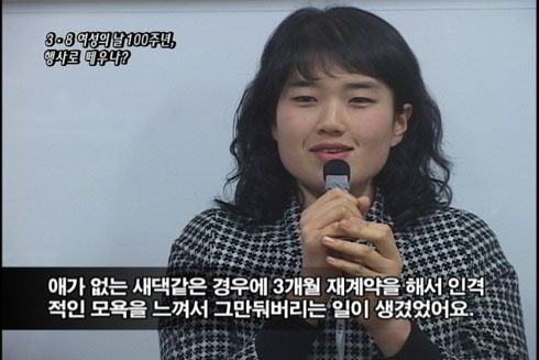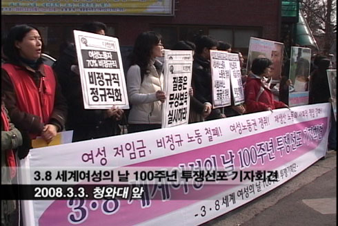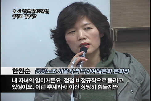 문설희/ 모든 문제를 경제성장으로 환원시키는 이명박 정부에게 제대로 된 여성정책을 찾아보기는 어렵습니다. 그나마의 여성정책도 여성에 대한 일자리 창출로만 국한되고 있습니다. 그러나 한국사회 여성의 문제가 다만 일자리가 없어서의 문제입니까? 그렇지 않습니다. 오히려 문제는 일을 해도 저임금이고, 비정규직이고, 불안정한 노동조건이고, 육아와 가사 등의 이중삼중의 부담을 지고 살아야 하는 것이라는 점입니다.