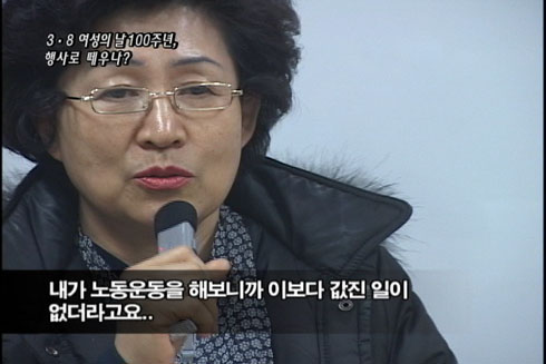 문설희/ 앞서도 말씀 드렸듯이 3․8 세계 여성의 날의 본래적 의미를 되찾는 데에는 신자유주의 세계화에 맞서 저항하는 여성들의 투쟁에 연대하는 것이 중요하다고 했을 때, 현재 한국 사회에서 가장 치열하게 저항하는 비정규직 여성노동자들과 함께 올해 3․8 여성의 날을 맞이하는 것은 자연스러운 일이라고 할 수 있겠지요. 특히 작년 3월8일 여성의 날에는 광주와 울산에서 청소용역 여성노동자들이 알몸시위까지 하면서 절박한 싸움을 진행한 바 있지만, 당시 여성의 날에는 ‘진보여성 총단결로 대선투쟁 승리하자’는 공허한 외침만이 존재했고, 그로부터 꼭 1년이 흘렀지만 여전히도 광주시청 여성노동자들은 복직되지 못하고 처절하게 싸우고 있습니다. 올해 역시, ‘진보여성 총단결로 총선투쟁 승리하자’라는 식의 공허한 외침만이 존재하게 할 것이 아니라면, 이러한 투쟁의 당사자들과 함께 한국사회 여성들의 삶의 현실을 드러내고 정말로 바뀌어야 하는 부분들이 무엇인지를 당사자의 목소리로 알려내는 것이 중요하다고 생각했습니다.