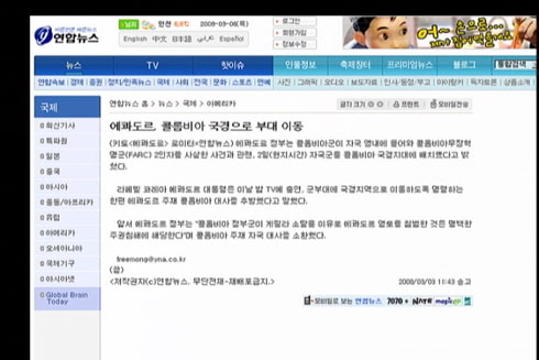 콜롬비아 국방장관의 1일 발표 내용을 바탕으로 콜롬비아 정부군의 공격에 의해 FARC 2인자가 사망했다는 내용의 기사인 것이죠. 콜롬비아 정부군이 어떤 방식으로 군사행동을 진행했는지에 대한 내용이 자세히 반영되어 있지 않은 것이죠. 이후 기사는 대체로 이에 따른 베네수엘라와 에콰도르를 군사행동 조짐에 관련된 내용이거나 콜롬비아정부군이 월경작전으로 통해 발견한 FARC와 에콰도르 정부간 유착관계 밝혀주는 자료와 관련된 기사들입니다. 한 쪽 입장에서 이번 군사작전을 보도하고 있다고 봐도 과언이 아닌데요.