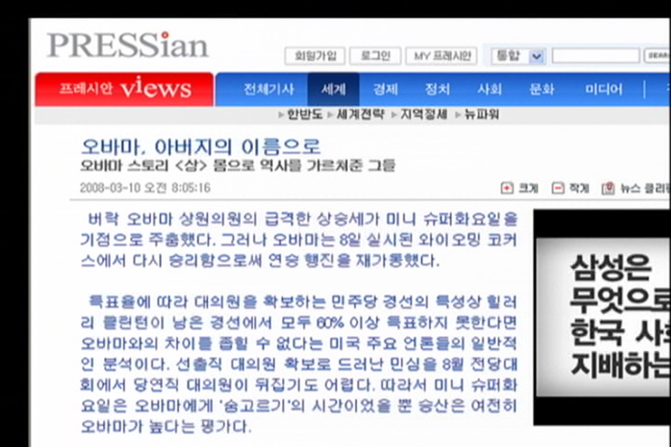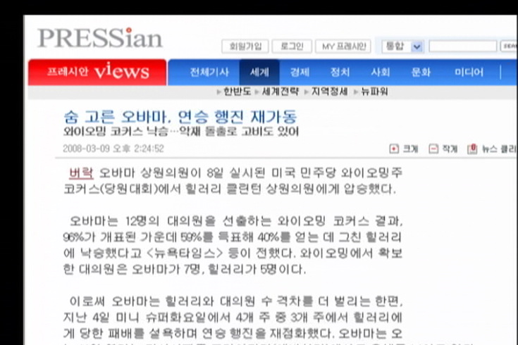 이꽃맘/ 네, 일단 프레시안이 그간 오바마에 대해 쓴 기사들의 제목만 살펴봐도 보도방향을 알 수 있는데요. 오바마가 지난 4일 미니 슈퍼 화요일이라고 불린 경선에서 힐러리에게 패배한 이후 와이오밍주에서 이긴 것에 대한 보도 제목이 ‘숨 고른 오바마 연승 행진 재가동’, 미니 슈퍼 화요일 직전에는 ‘오바마, 파죽의 10연승 떼 논 당상’이라고 제목을 뽑아 오바마의 승리를 확신하는 보도를 내보내기도 했습니다.