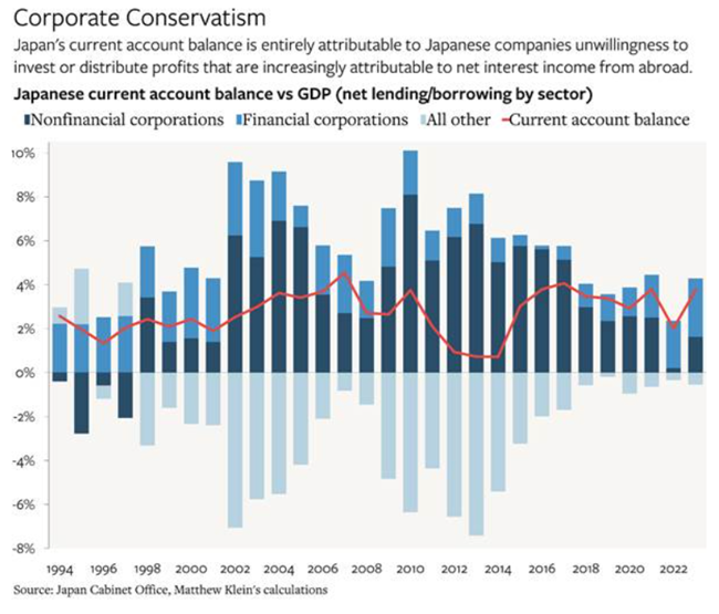 기업 보수주의(Corporate Conservatism) 일본의 경상수지 흑자는 전적으로 일본 기업들이 투자하거나 이윤을 분배하지 않으려는 태도에서 비롯되며이는 해외에서 유입되는 순이자소득 증가로 점점 더 설명되고 있다대비 일본 경상수지(부문별 순대출/차입)>